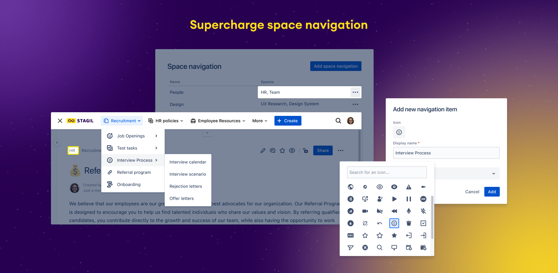 Manage and Enhance the Confluence Top Navigation and Overall Appearance. STAGIL Navigation for Confluence gives you the power to customize the appearance of Confluence, including many aspects that also considerably improve the user experience. Adjust the top navigation bar, include header images, add footer images and additional menus!