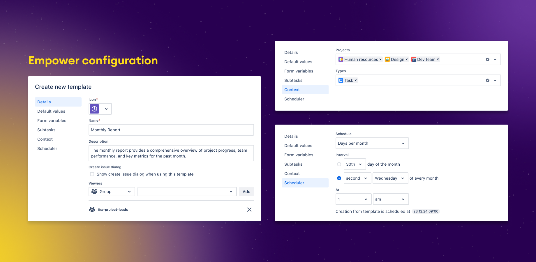 Share templates with your colleagues or schedule them for automatic reoccurring issue creation.